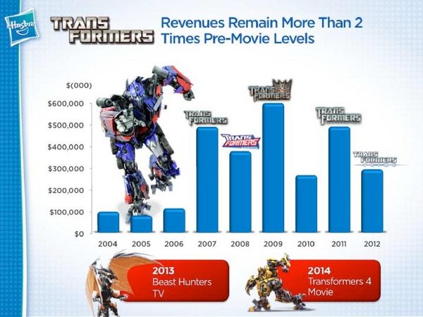 Deszaras_X Alto Consejo Cybertroniano  | #15•• Es medio OFF topic pero recuerden que en el "Hasbro Investor Event" anunciaron una serie para el mercado Chino en exclusiva: Brian Goldner mentioned a Transformers TV Series is being developed and will air exclusively for Chinese Transformers Fans: We have Transformers: Prime in China, And we are also developing a new TV Series for Transformers indigenous to the Chinese Market. Transformers is one of the popular brands there. The brand was there in the 80s so we are making a Brand New TV Series that is produced in China with Chinese partners and will air in CCTV [China Central Television]. Supongo que no tiene nada que ver con esa serie nueva para el 2014. Por cierto este cuadro es clarificador, Transformers Prime generó menos ingresos que Animated.