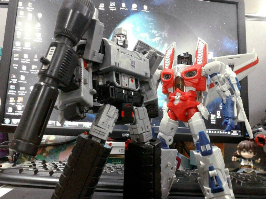 Ahora es donde vienen los problemas, si acepto a este megatron los demas esbirrros tendran que ir por debajo de el y ahi ya descarto a los Starscream MP, Soundwave MP e incluso a Quack Wave pese a que sean muy bonitos. De algunos aun no hay nada pero por ejemplo los seekers ya tengo a los de Igear que combinan perfectamente con el Hegemon.
