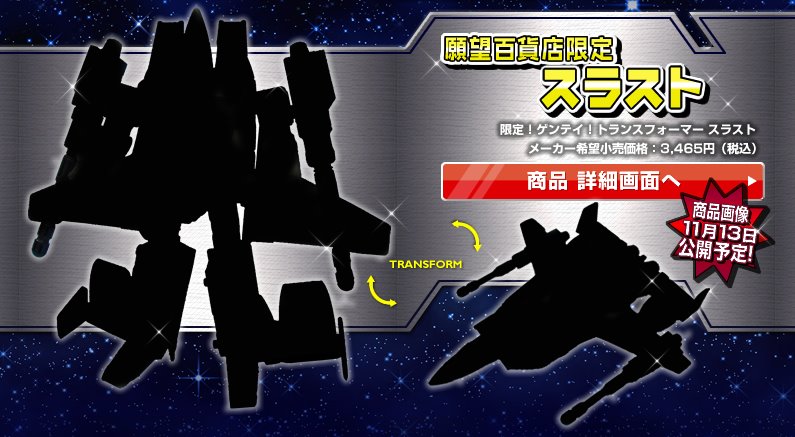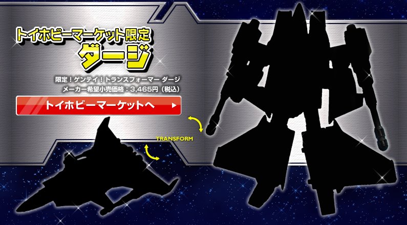mdverde Alto Consejo Cybertroniano | #1• TakaraTomy complace a los fan de los seekers y después de haber sacado a Thundercracker y Skywarp Henkei, aunque Thundercracker había salido previamente en USA como una exclusiva de la Botcon 2007, ahora se anuncian Dirge y Thrust Henkei. Ambas figuras, al igual que Thundercracker y Skywarp serán exclusivas de las tiendas Ganbo (Thrust) y Toy Hobby Market Exclusive (Dirge). Parece que las figuras serán algo diferentes de las de Hasbro, y tendrán las alas totalmente remodeladas. Parece que el precio sería 3,465 yenes, alrededor de unos US$35, aunque por ser exclusivas, el precio podría subir bastante con los revendedores. Las preórdenes van desde el 13 de Noviembre hasta el 10 de Diciembre y las figuras se enviarán en Marzo del 2009. ¡Al fin voy a tener mi set de Seeker Classics completo! Visto en: Allspark.com |