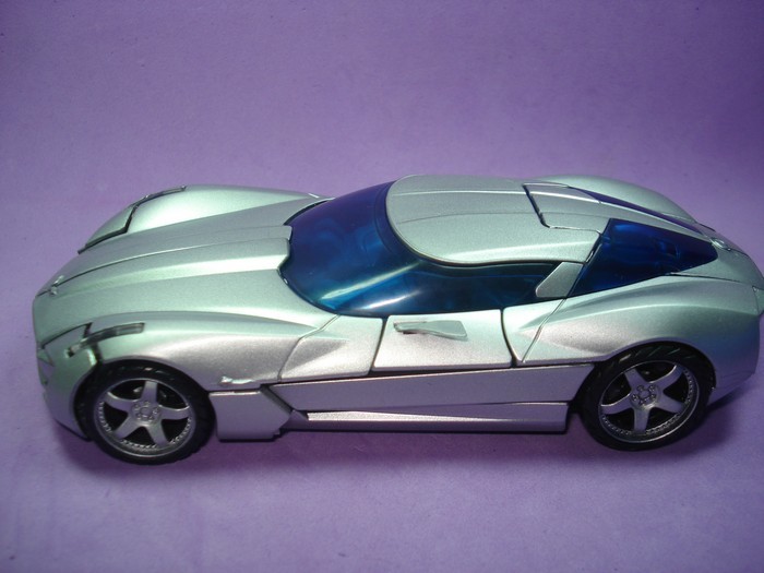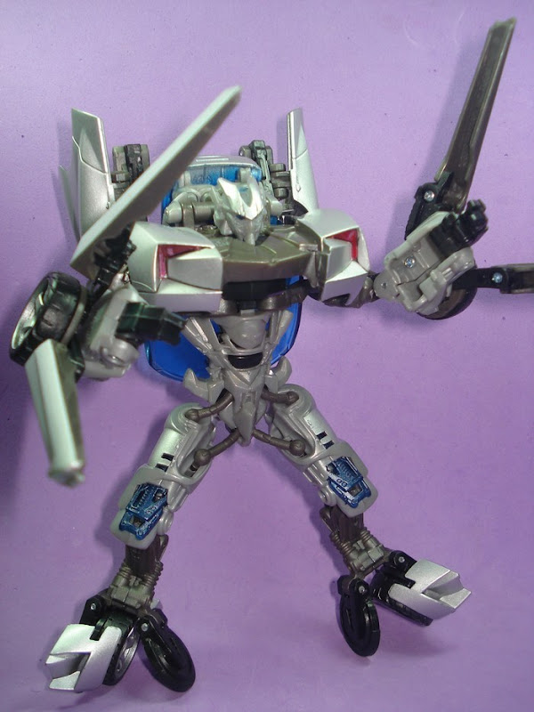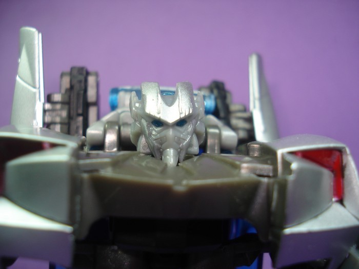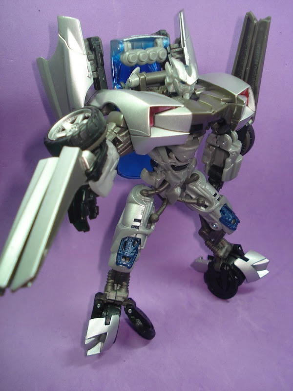 StarscreamNEO Alto Consejo Cybertroniano | #248• En modo robot se esmeraron tiene un diseño claramente reconocible, con detalles que lo hacen único y no solo otro auto más, su diseño sin duda es muy superior al de Jazz, el pecho, el abdomen y las uniones de los muslos con el cuerpo se ven geniales, la cara no aporta mucho pero no importa porque no desentona con el conjunto, las armas en sus brazos terminan de rematar ese toque especial en esta figura. El diseño del automóbil eso sí me sigue pareciendo "retro futurísta". En líneas generales de lo mejorcito que he visto hasta ahora junto con Starscream tatuado, habrá que ver que más sale. El robot al parecer está parado sobre dos de sus ruedas ¿patinará?