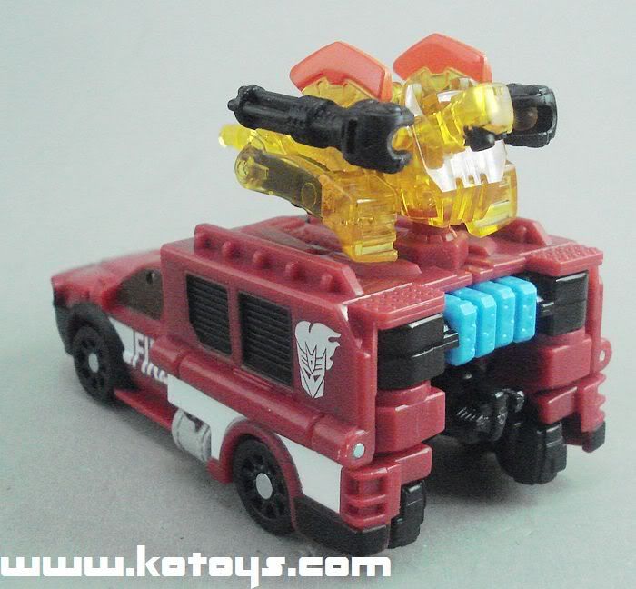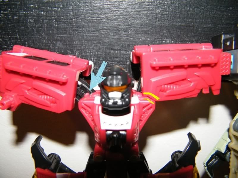 tambien dijo esto: "Estoy seguro que he encontrado la transformacion correcta para Smolder en modo combinado. Si miran a la curva amarilla en el hombro izquierdo, podran ver como dichas piezas estan moldeadas para encajar correctamente. No encajan en ningun otro modo. Tambien, donde esta la flecha azul en el hombro derecho pueden observar un tab que esta hecho especificamente para encajar el hombro en su debido lugar."