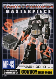 mdverde Alto Consejo Cybertroniano | #1• El inicio de la tercera temporada de la serie original G1 se lleva a cabo supuestamente en el año 2010, así que para conmemorar ese año, Takara Tomy ha creado una sección especial en su página web. La figura será numerada "MP-4S" y será de producción limitada, únicamente saldrán 2010 unidades y estarán numeradas desde 0001 - 2010. La figura vendrá con el cajón, en una versión de plástico claro (no es el que se ve en la imagen), y obviamente serán exclusivas para el mercado japonés. |