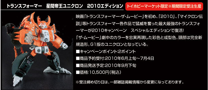 mdverde Alto Consejo Cybertroniano | #17• TakaraTomy ha actualizado su página web con las imágenes oficiales e información de Unicron, la segunda figura anunciada de la promoción Transformers 2010. |