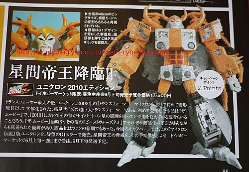 mdverde Alto Consejo Cybertroniano | #10• Otra imagen del Unicron que Takara lanzará como parte de la celebración del año 2010 apareció en el número 148 de la revista Figure Oh! En esta imagen se aprecian mejor los colores finales de la figura y algunos detalles como su cabeza. |
