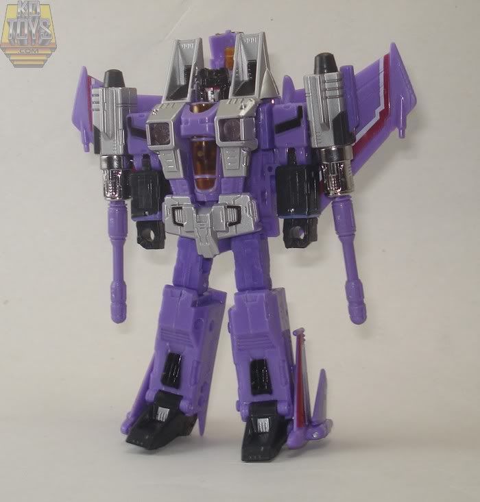 Irkush Powermaster Autobot / Decepticon | #80• Hola!!! Como Gandalf me pidio que comentara al llegarme que tal el Toxic Storm pues aqui estoy. Lo recibi el mismo dia que Shura, que ya comento sus impresiones al respecto, pero bueno tengo varios transformers en casa sin abrir porque ultimamente no estoy nada de animos, aunque con este aunque con unos dias de retraso he hecho una excepcion puesto que se lo debia a Gandalf. Estoy bastante de acuerdo en general con lo que ya comento Shura. Se trata de mi primer KO (bueno ya dijimos que mas bien se trata de un original al no existir version Hasbro-Takara pero si hecho por una empresa especialista en KO's) y lo primero que me sorprendio es la bajisima calidad del empaque, muy mala calidad a mi parecer, plastico blanducho y ni tan siquiera muy sujeto el Transformers en su interior. Una vez abierto me ha sorprendido que casi todas las partes de Toxic estan durisimas, con el consiguiente miedo a ejercer mas fuerza de la cuenta y romperlo... solo las piernas de Toxic estan mas blandas y un poco sueltas. En cuanto al resto no es que tenga poco que objetar, sino que muy muy muy bien la verdad. Los cañones preciosos, encajan perfectamente sin caerse y bien sujetos, tiene los simbolos decepticon en sus alas y la pintura a priori parece de bastante buena calidad y en vivo muy muy bonita, sobre todo con el contraste entre amarillo y cromados. Y una vez junto a otros seekers el resultado es espectacular, la verdad. Asi que si aun no te ha llegado Gandalf espero que lo haga pronto, porque te gustara. Un saludo y hasta pronto! |