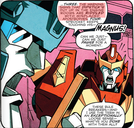 Darkscreamer Alto Consejo Cybertroniano | #611• Bien, de MTMTE #14 no puedo decir nada porque voluntariamente he decidio mantenerme fuera de la preview escrita para masoquearme hasta que salga el número en estos días xD, así que no tengo idea de qué están hablando jeje. En caso de que me arrepienta y la lea pos haré mis comentarios. Lo de Tailgate y Cyclo... Con respecto a las cabezas voladas, iba a empezar a despotricar de nuevo pero... vi la imagen de los Constructicons otra vez...