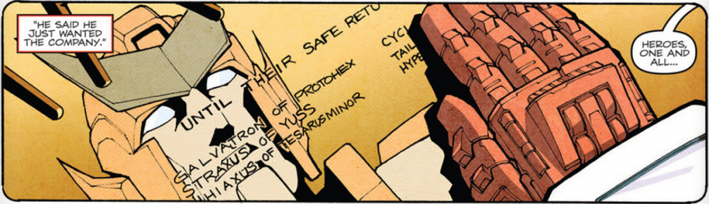 "Bueno, este es mi plan. ¿Qué creias? Te gusta." Y con respecto a esto... dos cosas... Si tomamos en cuenta lo que dijo Arcee en RID, "Se que fue lo que le hiciste a la nave de Rodimus. Vamos, se que no la destruiste. No eres tan despiadado- Pero eres frío y calculador." entonces podemos pensar en esto: