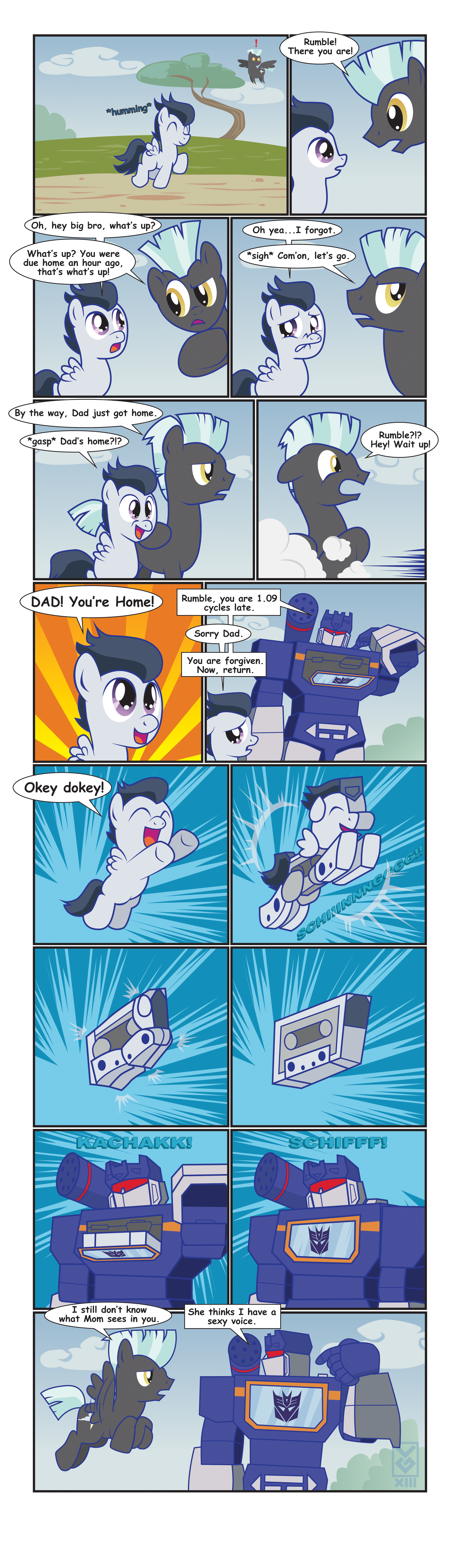 COMEQUESO_TM Alto Consejo Cybertroniano | #10• SPOILARZ!!!!1!!!11! MLP/TF #3 Historia 1: Discord y Fluttershy toman el té cuando de pronto llega Soundy, despliega sus casetes asustando a los animales, y Fluttershy cree que son mascotas XD Se le presenta a Soundy, que no la ve como amenaza pero si a Discord, pero Soundy no es rival para sus poderes. Mientras, Fluttershy actúa amigable con Ravage, Laserbeak y Ratbat pero Frenzy la agrede y Discord de pone serio transformando animales en robots contra Soundy! Fluttershy enojada vuelve los otros casetes contra Frenzy y cuando él menciona su amistad dejan de pelear. Megs llama a Soundy y dice que irán pronto... DUN DUN Aaaaaaaaawwww...! Historia 2: Rainbow Crash Dash flojea en 1 nube cuando le impresiona la velocidad de Windblade! Se presentan y deciden hacer 1 carrera! (cameos LOL! XD) Wind toma ventaja, Rainbow la alcanza, pero interrumpen Misfire y los Rainmakers! (wat, LOL!) les disparan pero Rainbow y Wind hacen que los misiles vayan hacia ellos y los vencen! Y las amigas declaran 1 empate =P DUN DUN LOL! Friendship: Superior XD Wind debería recordar a Rainbow por el #1, pero como es 1 crossover corto se puede pasar Mach Kick! Battle Unicorn! ![]() ![]() Tutorial para subir fotos