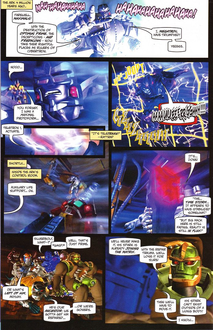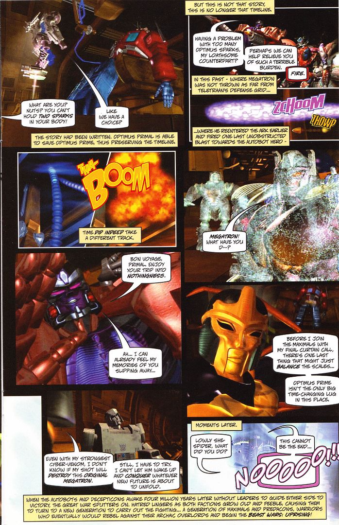 Holy Primus, 1 comic hecho con capturas? Sin intención paródica? QUE MAGIA ES ESTA!?!?!?!? Primal intenta salvar la chispa de OP, pero aquí Megs no fue arrojado tan lejos y lo destruye definitivamente, desvanenciendo a los Maxes, Blacky aprovecha sus últimos momentos e infecta a G1 Megs con su veneno pa que no lidere los cons, desvaneciendo a BW Megs... y desencadenando el horrible futuro alterno de Beast Wars Uprising... que fue especialmente malo pa Primal, Rhinox y Silverbolt!