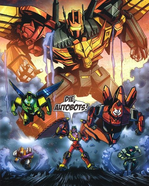 Próximamente en la siguiente BotCon! pero considerando como termina, no creo que alguien quiera comprarlo... Quien considera intrusos a los Classics. Destruye las naves antes que puedan subir, y daña las de Galva y co. Pero llega Grim y los recoge. Primus procede a atacar la Tierra, que se transforma!