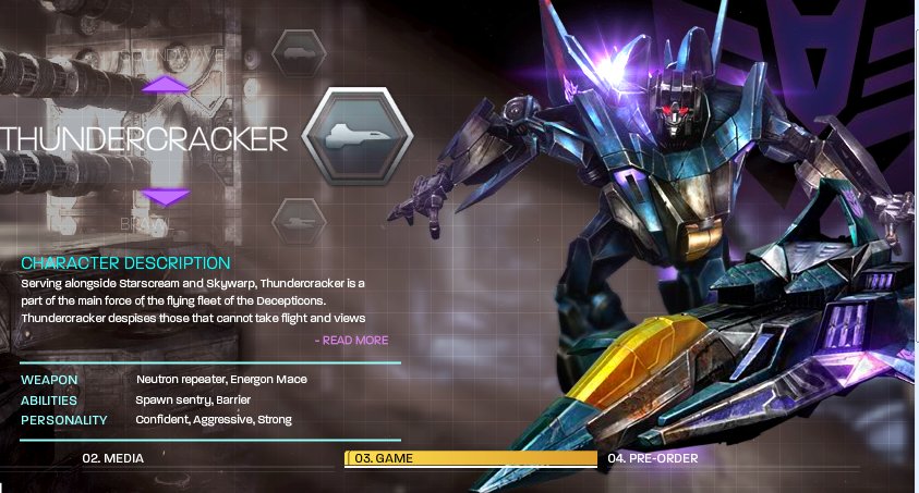 Rep1 Targetmaster Autobot / Decepticon | #186• Ok, lo preguntaba porqe en uno de los muchos enlaces q posteais, conseguí descargarme unos míseros segundos del trailer principal del juego. Y ahora es cuando los fans tenemos q reconocer q esta vez los de Activisión han hecho un buen trabajo: los trailers, con ser solo eso, trailers de apenas dos minutos, tienen una buenísima calidad, con magníficos efectos, tanto infográficos como de sonido; por fin se han apartado del ridículo estilo "Bayformer", para volver al estilo tradicional; los diseños están cuidadísimos, y muy elaborados (q son unos robots chulísimos, qé leches) y sus homenajes y parecidos con G1 son de agradecer; además, se han molestado en realizar fichas de cada robot y durante el juego vamos descubriendo no solo sus potencialidades y devilidades, sino también las razones por las cuales muchos de los personajes han elegido determinado bando. Y encima, tenemos la omnipresente voz de Peter Cullen. Toma ya. En fin, ya era hora de q hicieran algo como Primus manda. |