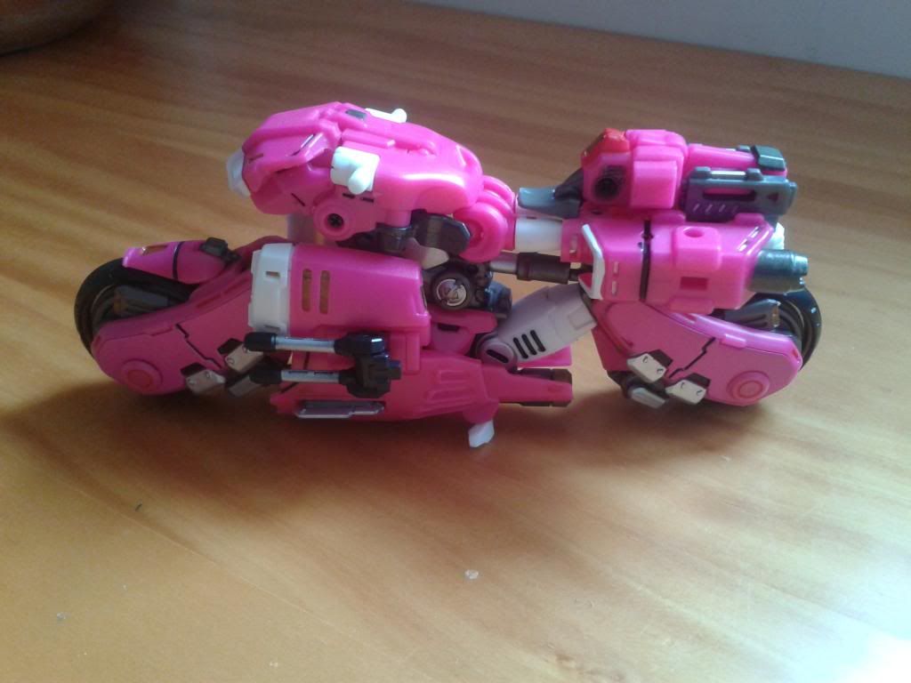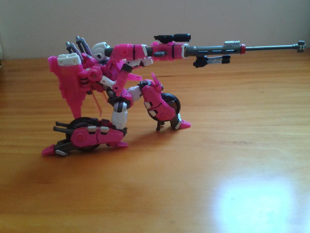 MODO VEHICULO Como he dicho, su modo alterno es una especie de moto cybertroniana o futurista, aunque a mí me recuerda un poco a la moto de Kaneda de Akira. Cuando transformas a Arcee, queda por decirlo así una estructura de moto muy básica e incompleta, y para ello tenemos todos los accesorios y armas que se acoplan a la moto y la dejan más presentable. Las alitas de transforman en los laterales de la moto que se sujetan por debajo mediante el cañón del rifle de francotirador, a su vez las espadas quedan sujetas también en estos laterales asemejándose a unos estribos o una hojas de metal cortantes.Como se pueda observar en las fotos se ven partes del robot, sobretodo una de las piernas y las manos, y parte de los brazos.La mochila donde se sujetan las armas queda como asiento de la moto, y las partes de la estructura del rifle, quedan como los alerones laterales del asiento. La figura sujeta el asiento mediante las pistolas. TRANSFORMACIÓN Como he mencionado más arriba, lo que puede hacer difícil la transformación son las instrucciones que son confusas, y si la analizamos fríamente, esta no es más complicada que la de un deluxe classic normal, así que siguiendo las instrucciones con paciencia incluso creo que se puede conseguir. No obstante si os quedáis bloquead@s con la transformación y no queréis arriesgaros a estropear la figura, lo mejor es recurrir a una video-review. Una vez montada la estructura principal, es empezar a montar las armas encima del armazón como si se decorara un árbol de navidad XD, y para eso con las imágenes que hay o con una video review queda arreglado. Algunas piezas puede que vayan duras, como las empuñaduras de las armas, y las piezas de los alerones laterales del asiento/ partes del rifle. CONCLUSIONES PROS: La figura es notable para tener una representación classic del personaje de Arcee, y hasta la fecha creo que es la mejor representación de esta (A espera de la Arcee de MMC) CONTRAS: Básicamente dos: - Creo que la figura hubiese mejorado de haber sido más compacta, y hubiese dependido menos de los accesorios, al menos que hubiese incluido las alitas más o menos como la Arcee de Prime, - El precio. Como cualquier producto de tercera compañía, es cara. Es difícil que en ebay o sitios especializados, la encuentre a menos de los 70 y pico euros que hasta hace poco rondaba (y ya sabeis que si se deja pasar un tiempo, lo mismo redobla su valor).
