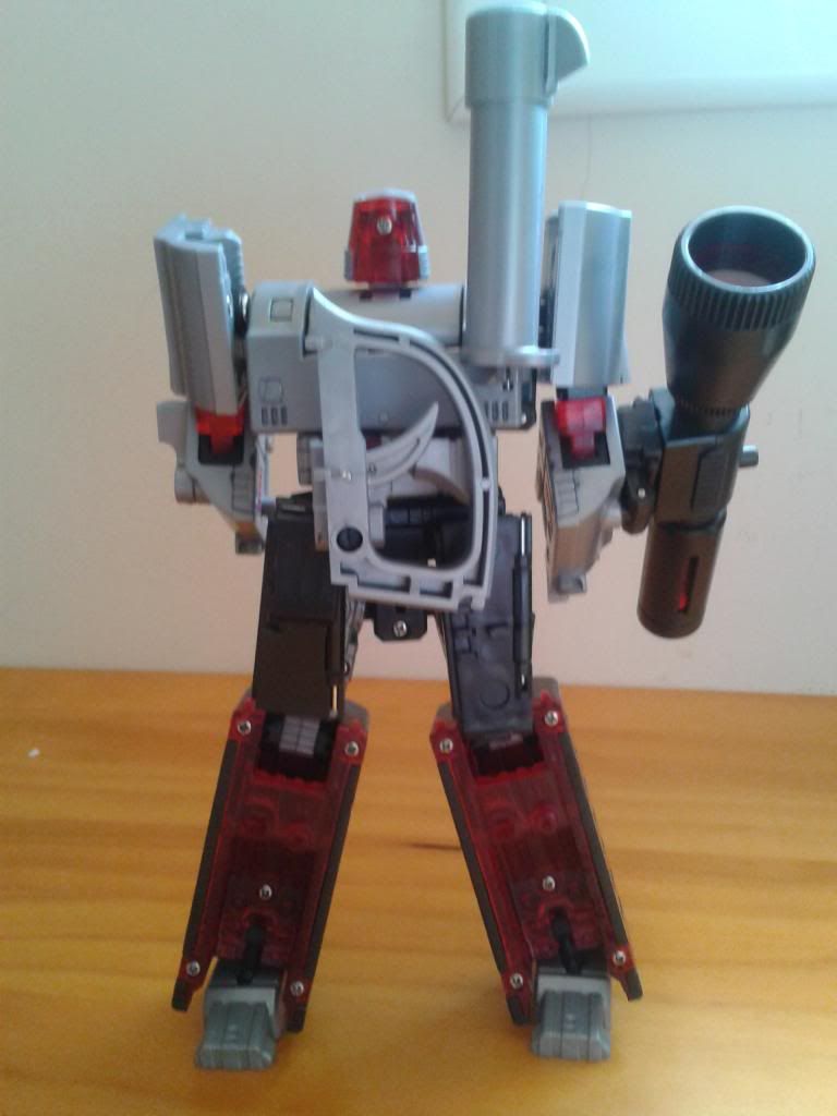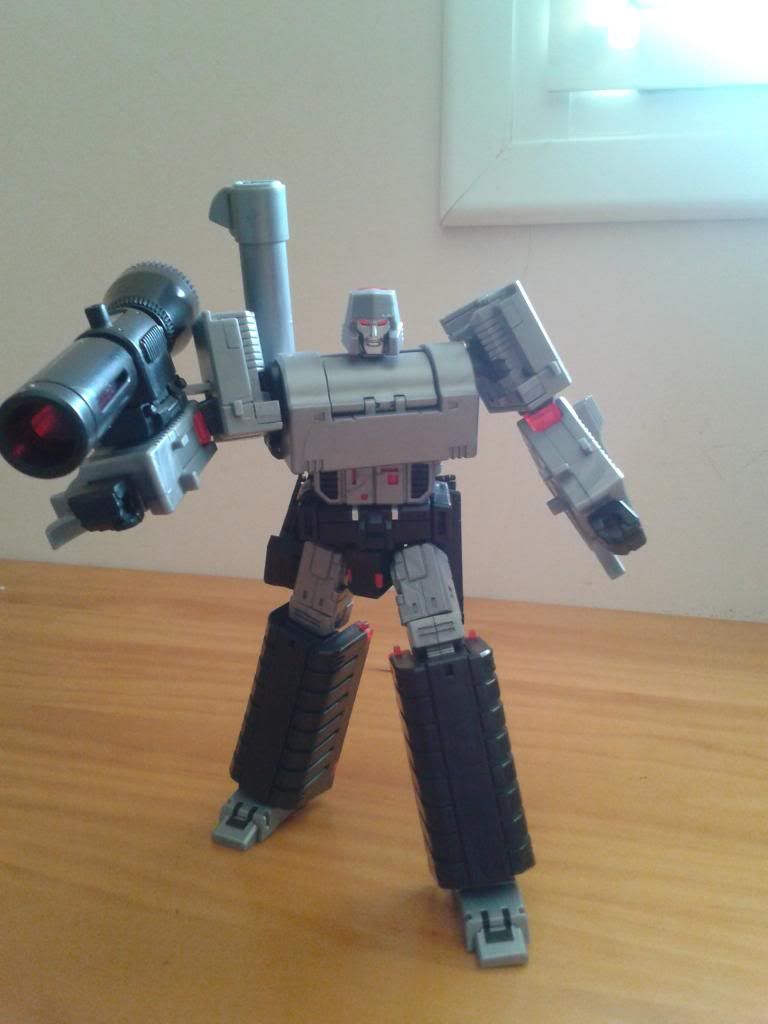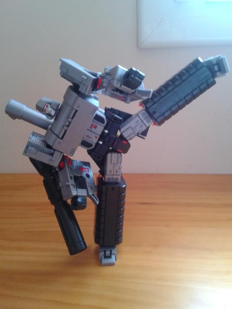 * ya se que el soporte no va así, era para hacer la foto TRANSFORMACIÓN Como he referido más arriba con las instrucciones se puede transformar al keko, eso sí, la parte de colocación del gatillo, puede llegar a ser confusa y complicada y dar algún que otro dolor de cabeza. Es una transformación complicada, sin lugar a dudas. Yo me pelee con él un buen rato con esta parte y como he dicho si las partes de la cadera no encajan bien, o sea que encajaba una y se me salía la otra, puede llegar a ser bastante frustrante, de ahí que sea una figura más de exposición que para jugar con ella. CONCLUSIONES PROS: La figura más fidedigna al Megatron de la serie animada G1, a un tamaño Classic hasta ahora CONTRAS: - Defectos de fabricación ( algunos dignos de un KO). - El precio como es costumbre en productos de terceras compañías. ![]()