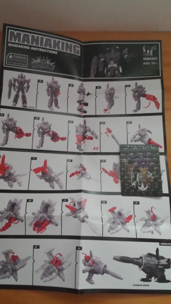 Finalmente llegamos a esta figura que vamos a analizar. Esta de una Tercera compañía llamada Unique Toys, quien lo ha bautizado como Maniaking Messiah. Mencionar que esta figura ahora tendrá disponible un repintado más acorde a la serie/película ( hay que decir que en la serie vemos a Galvatron con un tono o más azulado o más violeta según el episodio...) EMPAQUE E INSTRUCCIONES La caja es simple, sin demasiados ornamentos, solo se ve la imagen animada del personaje en la cubierta superior de la caja, y en los laterales imágenes de la figura, en modo bot y en alterno ( una en cada lateral) La figura dentro de la caja va muy bien protegida con una buena capa de espuma (entre algodones podríamos decir). La caja sólo incluye la figura, el accesorio del cañón, y las instrucciones con una card de características.