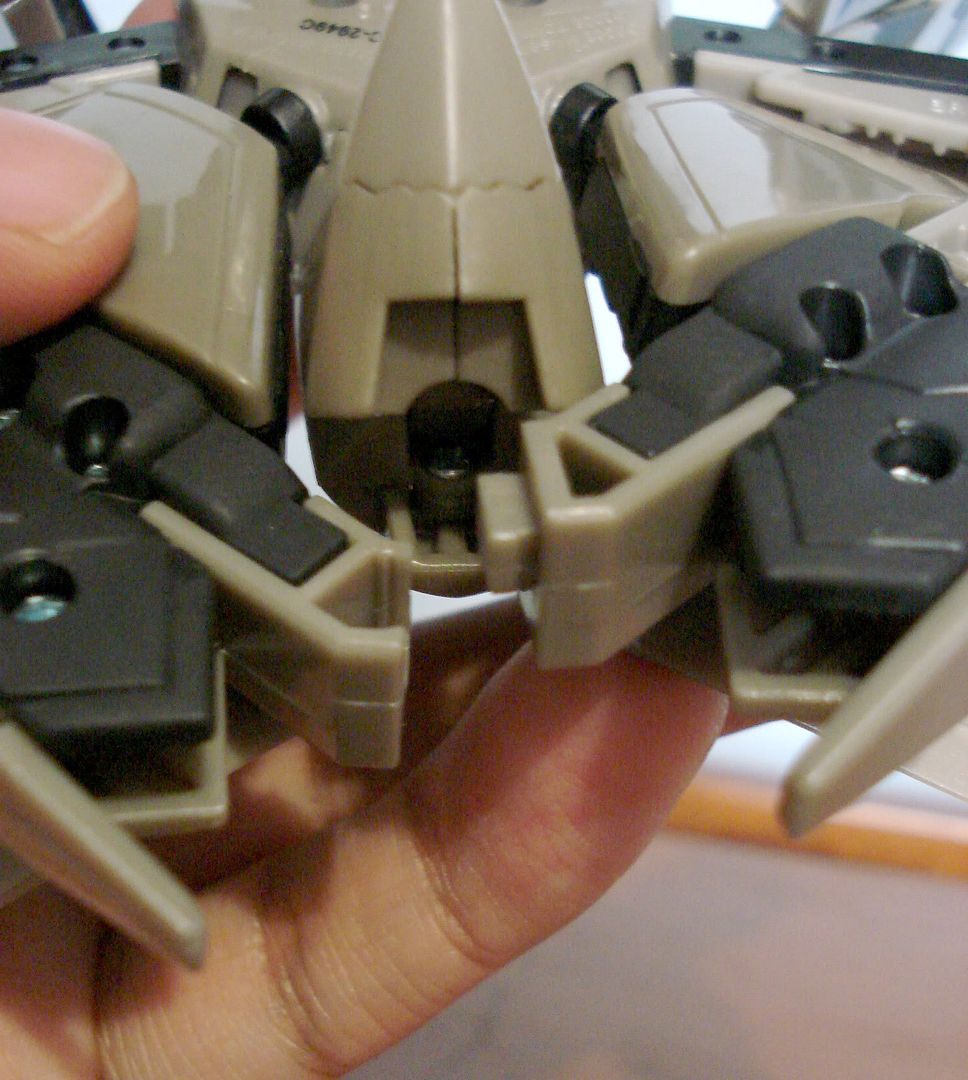 En mi figura he notado que las partes de las alas que se pliegan a la espalda del robot están un tanto flojas, creo que ahí no hay pin de metal sino que se sostiene con plástico nomás, y también que extender los brazos para que funcionen los codos es muy muy duro. Modo Robot: