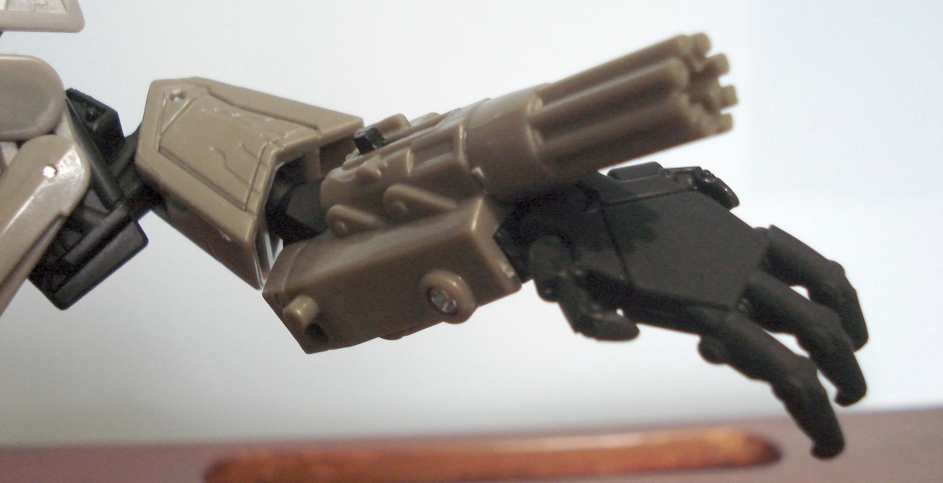 No he probado a posarlo mucho, pero la articulación es adecuada, su defecto por ese lado es que resulta teniendo brazos de "bruja" porque las muñecas se doblan en dirección contrara a los codos. Aquí en la foto se ve que los cañones habían sido concebidos para ser plegados, y que las manos no son articuladas (pero quizá sea posible hacer que las palmas se doblen como sale en las instrucciones, sería cuestión de hacer unos cortes más bien simples, pero quiero ver si alguien se atreve a hacerlo antes). Me da la impresión que las piernas del anterior eran más posables además.