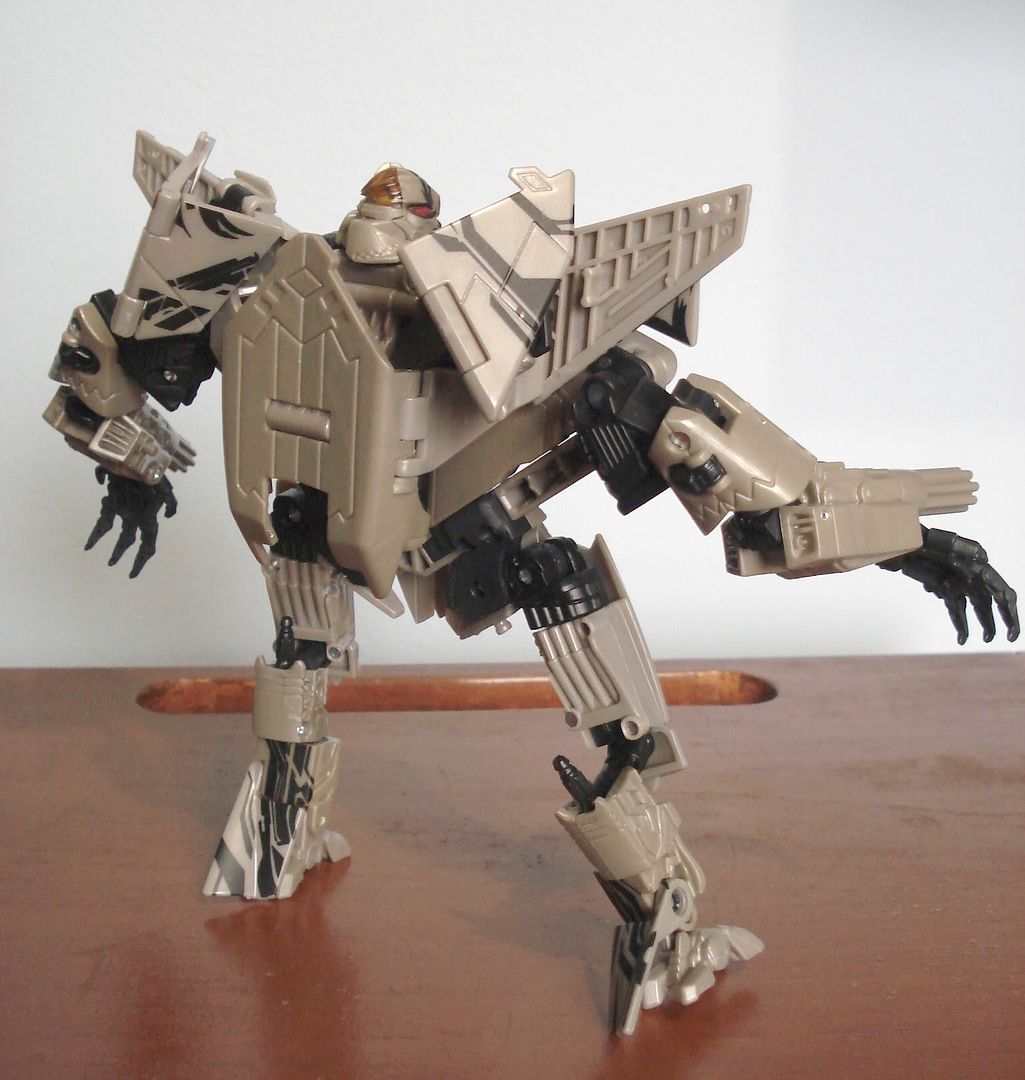 Casi olvidaba mencionar la decoración del avión: sigue siendo color beige como la figura anterior, pero la gran cantidad de "tatuajes" estampados negros lo hace ver bastante más impactante. Es algo que pensé al principio que podía verse algo ridículo, pero no es así para nada, es muy agradable la deco. Todos ellos están muy bien impresos. Transformación: