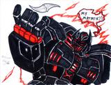 De5tructor Powermaster Autobot / Decepticon  | #149• Heheheh, el parecido se nota sin tener que ver más allá de lo evidente xDDD Realmente para dibujar el mechaoso me fijé en el diseño que hizo un compañero de otro foro, ahora, no sé si él se fijó en un bearbill para dibujarlo, heh. Gracias por el comentario, Alpha, y espero que te animes a dibujar alguito para mostrárnoslo acá en el foro. Y para completar el post, pongo la pseudo portada de War of the Primes con tinta sobre la rayamentazón de lápiz que eché en ese papel, para que se entienda mejor. Venga y dispare su opinión.