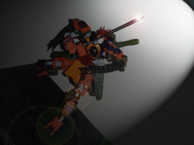 Algo que he notado con este kit (y no se si ocurre con el de otras personas) es que el casco queda flojo, ya después de tenerlo en modo tanque tuve que volverlo a transformar a mitad de camino para ajustarle el casco que se le había salido nuevamente.... También cabe mencionar que la pieza que se utiliza para cubrir la empuñadura de la katana no encaja, solo esta ahí puesta, parece el motor de un helicóptero cuando la mueves con el dedo. Pero con todo y todo, si antes Bludgeon era una figura genial, ahora lo es mas con este kit. Nada mas miren que POWAH se ve con su nueva katana: