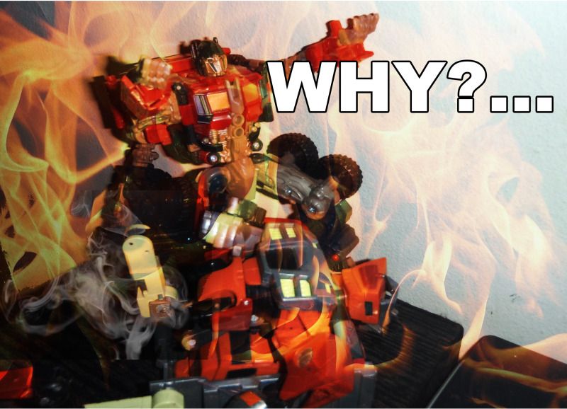 - Voyager ROTF Optimus Prime. Le falta casi todo lo que se le puede quitar, los paneles de las piernas, los guarda-lodos, las hombreras, uno de los tanques donde va la pistola y la parrilla delantera. Lo chistoso es que este es el primer Optimus de este molde que ha llegado mas entero. - Animated Wreck-Gar. A este amiguito le faltan las piernas, y con este se suma a mi colección des-patada de Animated (junto con Snarl y Sentinel Prime) parece ser un trend de esta linea ya que de las únicas 7 figuras que tengo 3 las he encontrado sin piernas, mas las que he visto y no he comprado. Como si la linea de Animated hubiese pasado por un campo minado... Pretty much like...