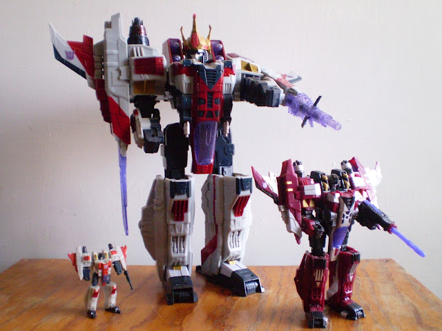 | Sutasukurimu Alternator / Binaltech | #11• Es menester decir que este año fue el año de Transformers en mi vida, compré mucho y me concentré en ello, fue un año con grandes figuras cada quincena, esa año no será así. En fin, sin más preámbulos los dejo con las mejores diez figuras que compré en el 2011, más tres menciones especiales. 1. Unicron Serie Welcome to the Transformers 2010. Supreme Class Producido por Takara El 2010 fue el año en que Takara conmemoró los acontecimientos de la película de 1985, al igual que los de la tercera temporada de Transformers pues en la ficción los hechos ocurrían en ese año, así que tuvimos reediciones y repintados para celebrar esto. Uno de los más esperados fue Unicron, repintado de la serie Armada con un nuevo molde de cabeza. Siempre quise tener a este gigante, pero nunca había podido conseguirlo, cuando Takara anunció esta maravilla no pude decir que no, aunque esta fue mi adquisición más cara del año. Aún no lo he abierto del todo, estoy preparando un gran artículo, al tamaño de él. 2. Bruticus-Colossus Series Revenge of the Fallen-Crossfire II. Combiner Class Producido por Hasbro-Fans Project La presencia de las Terceras Compañías no ha dejado de ser polémica, continúan sacando productos a raudales, prácticamente todas las semanas hay nuevas noticias. Aún con esto una de los figuras más esperadas desde hace ya casi un año fue el set de Fans Project para el Bruticus Maximus de Hasbro, un repintado del molde original que salió en la serie Energon. Dos nuevas figuras y un Upgrade Set conquistaron a más de un detractor, además tuvimos que esperar los múltiples retrasos, pero la espera y el dinero valieron la pena. Este fue un regalo de cumpleaños. 3. Buster Optimus Prime Serie Revenge of the Fallen. Leader Class Producido por Takara Esta figura ya tenía poco más de una año de haber salido, tuve la serenidad de esperar y no comprar la versión de Hasbro, así que cuando Takara decidió sacar esta versión, que como extra tiene un arma que se transforma en las pipas del combustible, además del excelente terminado de la pintura y el cromado en algunas partes, supe que había llegado el momento de comprarla. debo confesar que aún no lo transformo, el instructivo me sorprende de sobremanera. 4. Starscream Ghost Series Masterpiece y Gentei. Masterpiece y Deluxe Class Producidos por Takara Sí, muchos consideran un exceso este par de figuras, sólo para Zombie Fans ocompletistas. Difícil es elaborar una defensa, pero me tiene sin cuidado, estás dos piezas bien valieron cada peso que costaron. Una de las cosas que más me ha fascinado en ellas es ver el comportamiento interno de un Transformer, pues se puede apreciar al detalle como las piezas de pliegan o despliegan según sea el caso, además ¡el plástico traslucido me encanta! 5. Wing Blade Optimus Prime Serie Animated. Voyager Class Producido por Takara Esta es otra de las figuras que más se dio a desear durante el 2010, anunciada desde julio de 2009 por Hasbro vio la luz hasta abril de 2010 de la mano de Takara. Aunque hubo cambios, uno de los más significativos fue que en lugar de usar el molde de la versión Deluxe se usó la Voyager, además del plástico traslucido, algo sorprendente, dado que comúnmente se anuncian este tipo de cosas, esta fue una grata sorpresa. En la foto aparece con el martillo de la figura de Ultra Magnus y no con él que trae originalmente, que es más pequeño. Por poco me quedo sin esta pieza, afortunadamente alguien ya no la compró a mi dealer de confianza y finalmente terminó en mis estantes. 6. Ultra Magnus Serie Animated. Leader Class Producido por Takara Comprado en Ben´s Items Esta es otra pieza que no llegó nunca a los Centros Comerciales mexicanos, y ya me había hecho a la idea de no tenerla en mi colección, sin embargo, sorpresivamente, la trajo mi dealer de confianza. El acabado es diferente de la versión de Hasbro, con pintura metálica y tonos más azulados.Me ha encantado que esté "armado hasta los dientes", además las frases que dice están en japonés. 7. Starscream Serie Alternity Producido por Takara Esta figura me inspiro a hacer la primer review con el estilo Sutasukurimu, es tan extensa que se ha vuelto la entrada más popular del blog, con visitantes de todos lados, incluso Nippon, además si uno busca en Google images las primeras imágenes que arroja la búsqueda son fotos mías (y otras de una tal Mdverde... [jeje]). La figura me encanta, aunque debo decir que de los Alternity es el menos favorecido, pero su articulación es excelente. 8. Starscream Serie Cybetron. Supreme y Voyager Class Producidos por Hasbro Comprado en Mercado Libre y en Collectible Toys Review pendiente por Sutasukurimu ¬¬ Este año por fin pude completar los Starscream de la Trilogía Unicron, justamente me faltaban los de la serie Cybetron. La figura Supreme es inmensa, es imponente, y la poca articulación no hace más que darle un aire como de estatua. Las dos las pude conseguir nuevecitas, en sus cajas y todo. La versión Voyager es de un paquete exclusivo de Toys´r Us. El Legends está de colado en la foto. 9. Starscream Serie Masterpiece Movie Series y Revenge of the Fallen. Masterpice Movie Series y Leader Class Producido por Takara y Hasbro Igualmente para muchos puede ser injustificada esta doble compra, pero creo que vale la pena tener los dos, uno para trastear, el otro para admirar. Por fin Starscream Movie tiene una figura que le hace honor y reproduce mejor esa figura de mono-pollo. Bromas aparte tiene un tamaño justo para la escala que debería tener con respecto a otras figuras, además los gimmic de los brazos, los sonidos y el movimiento de la cara. Lo malo de la versión Leader es que trae el audio editado, la Masterpiece no la he abierto, así que no se que diga todavía. 10. Primus Serie Welcome to the Transformers 2010. Supreme Class Producido por Takara Compr
