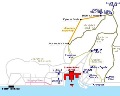 Mapa de la isla de Miyajima, con sus templos etc. Tomamos el ferry que siempre es divertido, el trayecto apenas dura unos 15 minutos. El enorme Tori rojo caracteristico nos da la bienvenida. Es interesante que vayais temprando antes de que suba la marea y cubra completamente el Tori. Bajamos del Ferry, pasamos por la shopping store que tiene varias tiendas y restaurantes hasta el tori. Hacemos muchas fotos, nos damos cuenta de que el suelo esta lleno de moneditas, incluso el tori tiene muchas enclastadas en su piel debido a que el mar a hecho su efecto, evidentemente no cogemos ninguna... la duda ofende pero por si alguien se preguntaba, no, no se puede coger ninguna, es sagrado y se debe respetar. Vereis que la buena educacion y el terrible respeto es algo caracteristico de ese pais, seguramente por eso esta en el lugar que le pertoca, y ni mucho menos puede compararse con otros. Luego vamos al templo, el suelo esta lleno de casas de cangrejos, que saldran poco tiempo despues, cuando suba la marea. Santuario Itsukushima. Este templo sintoísta Patrimonio Mundial de la UNESCO, está dedicado a las tres hijas de la deidad sintoísta de los mares y las tormentas Susano-o no Mikoto. Los edificios del primer santuario erigido probablemente en el S.VI han sido destruidos muchas veces. El edificio actual data de mediados del S. XVI tras haber sido reconstruido de acuerdo a su modelo anterior del S. XII. Aqui se celebran bodas y fiestas, no recuerdo cuanto vale la entrada pero no era caro ni mucho menos.