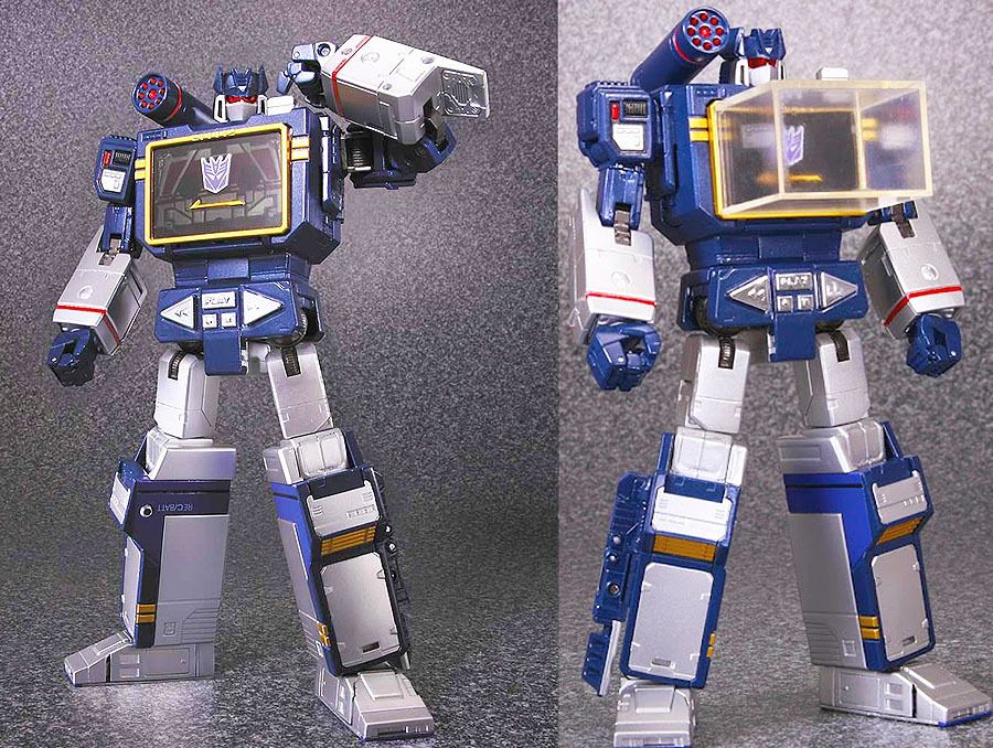 Decep Alternator / Binaltech | #615•• Pues... aqui tenemos el MP-13 Soundwave. Lo primero que llama la atencion es el tamaño de la caja y su precio, 130 euros, mas menos, comparado con los Sidewispes y Red Alerts, uno puede pensar que no es tan caro como los otros citados. La caja eso si, el tipo de carton sigue siendo de una calidad dudosa, o cuanto menos inferior al de los primeros MP, hasta aqui han llegado los recortes de Takara- Tomy. Pero por tamaño uno durante un momento puede imaginar que Soundwave sera grande, de la escala del primer Prime y Megs... claro esta, para eso uno, debe aislarse practicamente del mundo, volver a nacer y no saber los tiempos que corren.... tamaño de caja. En las solapas ya no existen los puntos esos Transformeriles que hacian gracia. Pero abrimos el bicho para comprobar el tamaño, bien, no el mejor, vistos los primeros MP pero ese par quedan tan lejos que ya ni me acuerdo, asi que bien. Como sigue siento habitual en la linea, es el mejor Soundwave hasta la fecha, eso no quiere decir que no sea mejorable, que lo es y no poco, pero bueno. Lo vemos. Seguramente de accesorios es de los mas chulos o completos. Te viene un Megatron en pistola, y ya tenemos..... bueno, no se, muchos, recordemos que con Starscreams etc, tambien venia ese complemento, tambien trae un cañon una mano rara que la saca en la serie alguna vez, una caja de cubos de energon vacia para meterla en el pecho, una tapa del cassette con cuadricula, Laserbeak y cajita para Laserbeak.