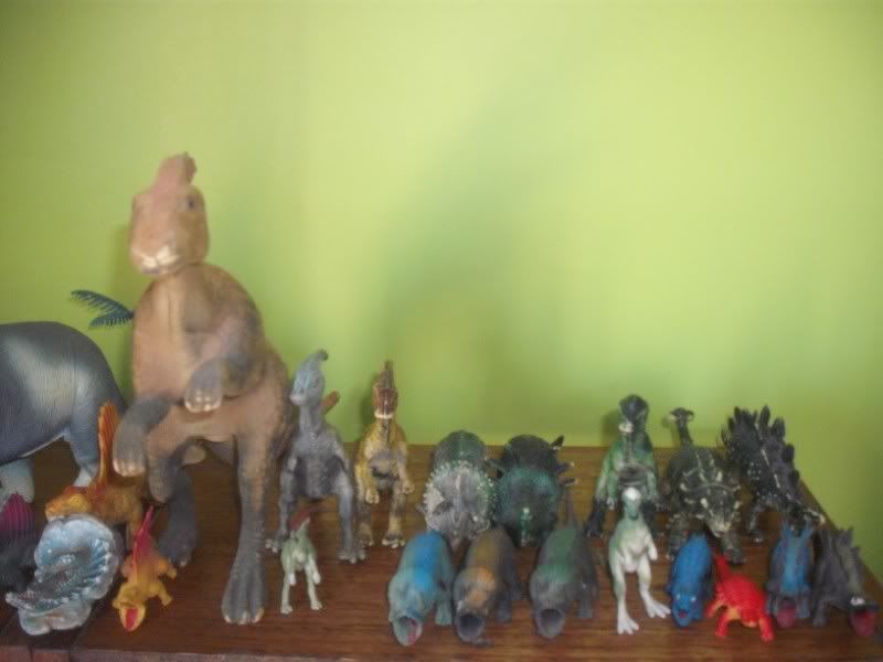 Parasaurolophus extra grande, 2 de porte normal, Triceratops, Styracosaurus, Pachycephalosaurus, Euplocephalus y Stegosaurus Atrás de I a D: Tyrannosaurus, Tarbosaurus, Albertosaurus, Nanotyrannus, Ornithomimmus, Struthiomimus y Pelecanimimus
