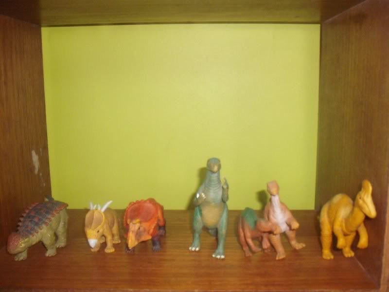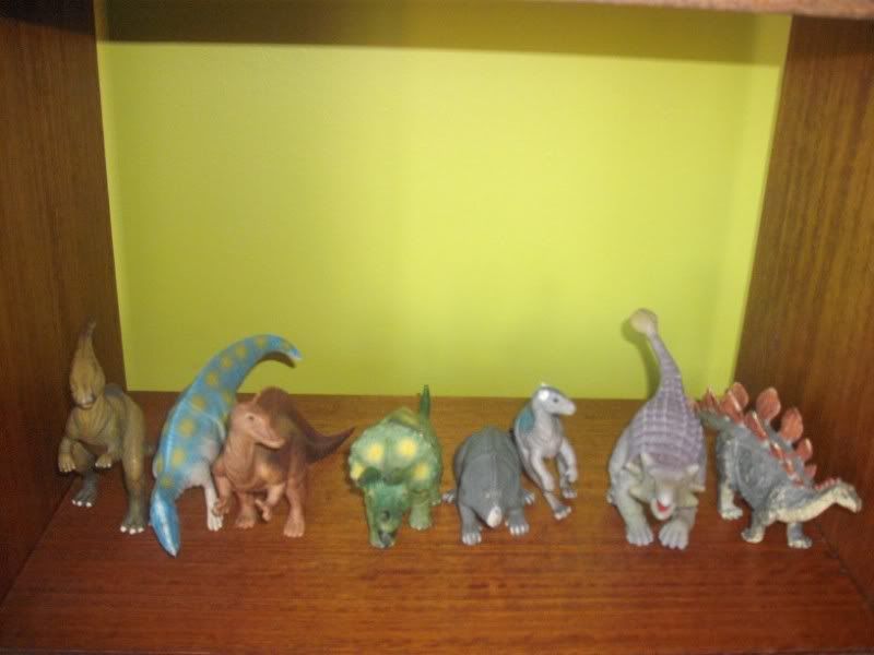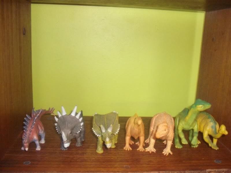 De I a D: Parasaurolophus, Muttaburrasaurus, Ouranosaurus, Triceratops, Protoceratops, Stygimoloch, Ankylosaurus y Stegosaurus que ZOMG!1! tiene una pata chueca! Y al parecer todos vinieron así