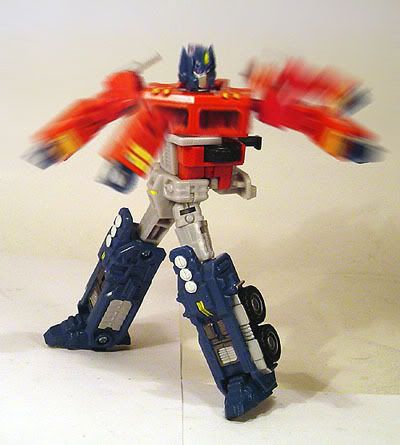 Thunder punch He-ma.... Optimus Prime Optimus tiene una palanca q se presiona en la espalda, el resultado de empujar dicha palanca es que la figura gira el torax a lo loco repartiendo mangazos a lo remolino, cual He- man Thunder punch. Esta acción es la que deja el torax suelto perdiendo todo el control para ciertas poses solo guiandose por el peso. Pq un transformers tiene este tipo de gadget.. ni idea, quiza en la onda classic un homenaje a master of the universe..o.O . Por cierto no trae fulminantes.