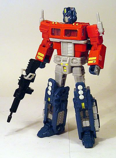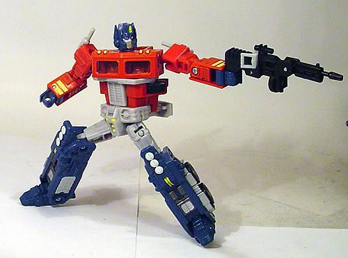 Modo Robot Es un robotmaster mejorado en articulación pero feo de cabeza, debe estar entre los Primes mas feos de cara q recuerde. Para no ser tan negativos veamos lo bueno, la articulación esta lograda, bastante buenas poses, el rifle es novedoso y... y eso. Lo malo, le cuesta mucho afirmarse en cualkier pose, la articulación del torax (mas adelante explicaré su funcion) queda bailando, no tiene ningun tope. En cuanto al acabado y materiales es regularon tipico hasbro, aunque los colores tan muy deslabados, si bien son los colores clasicos todos son bastante opacos.