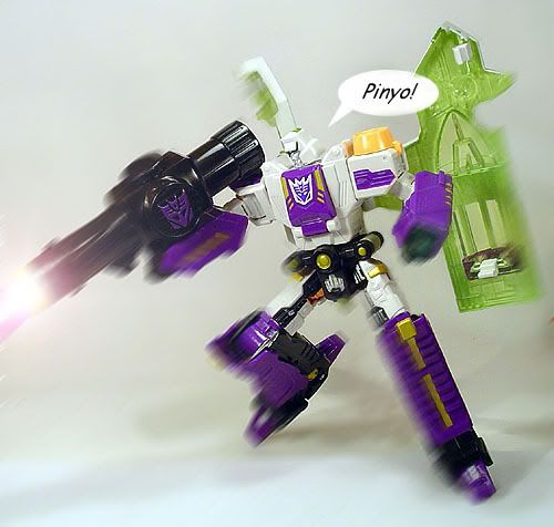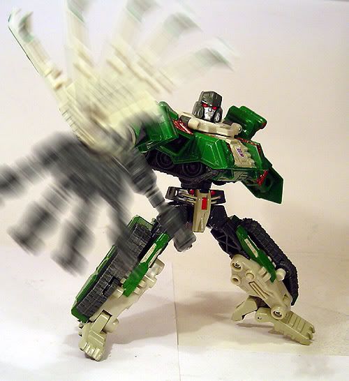 Hurricane Hord.... Megatron Siguiendo con el homenaje a Master of the Universe, Megatron puede expandir las partes del cañon formando una especie de hélice (vamos, el cañon pa un lado y la lata/tenaza pal otro) y asi como Prime, presionando un botón ubicado detras del codo, se puede hacer girar dicho aparatejo, recordando al Hurricane Hordak.