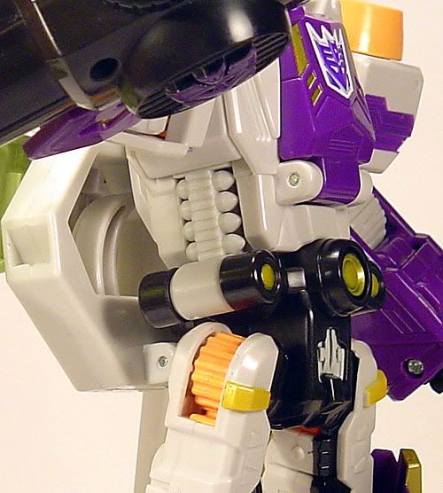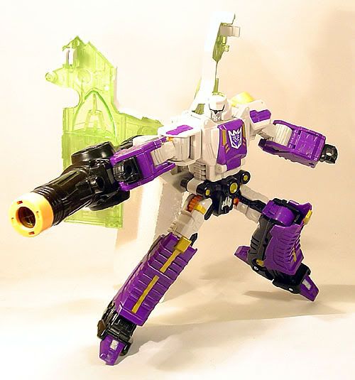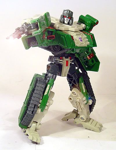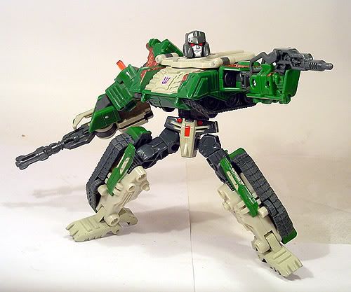 Modo Robot Como robot cumple bastante bien, muy articulado quiza el mejor de los Megatron Tanke en este aspecto, firme y estable, bastante armónico en forma, con un muy buen esculpido de cabeza (me recuerda mucho a Megastorm mas que al mismo Megs G2) ..pero ese brazo derecho....Tenia todo para ser genial y tener un cañon montado en el brazo al estilo G1 en un tanke, pero la verdad no se pq no le hicieron el resto del brazo, al final quedo un chongo con un cañon montado al dorso, mal no se ve, pero queda esa sensación de que pudo ser mucho mejor.