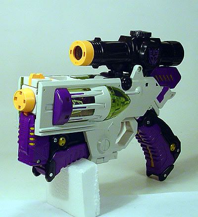 Una pequeña reseña sobre esta figura, a mi gusto una de las mejores de Classics. Modo Alterno La vuelta a la pistola despues de mas de 20 años, en si no es ninguna maravilla pero cumple muy bien, ninguna cabeza asomada o una mano a la vista, es una pistola echa y derecha, no es realista es cierto, tiene mas pinta de laser de kamen rider que de una pistola concreta, pero no se ve mal, aptica para un adulto, buen tamaño. La mira no es funcional, de hecho apenas se ve un carajo XDD, pero algo se ve y tiene una cruz de objetivo pertinente, dentro de este punto mi primera critica, el logo Decepticon que tiene pudo ser mejor, se ve algo pobre es su realización, mucho mejor el del pecho de la figura. El gatillo si es funcional pero obviamente no dispara nada, lo que se supone es la salida del cañon parece una tapa de desechable, pero como dije antes, es una pistola de juguete y sinceramente, y conociendo en mano el Nerf Maverick, Megatron se ve mucho mas pasable.