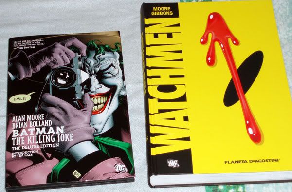 Pues sí, hoy tenemos doble ración de Alan Moore, considerado por algunos el mejor guionista de comics de la historia, si bien no por mí (y no tengo ganas de empezar otra vez el debate). Por un lado la "edición deluxe" de La Broma Asesina y por otro el macro-tomo de Watchmen. El primero en inglés, el segundo en español (de verdad que Planeta se está luciendo últimamente, esperemos que la cosa dure!) La gracia de esta nueva edición de una de las más emblemáticas historias del Joker que existen es, aparte de la pasta dura y algún que otro extra, el nuevo coloreado a cargo del propio dibujante, Brian Bolland, que tras trabajar con Moore se retiró de las páginas interiores y pasó a dedicarse únicamente a hacer portadas. Claro, cuando ya estás encumbrado, para qué volver a ensuciarte los dedos dibujando más de la cuenta, ¿eh Brian?