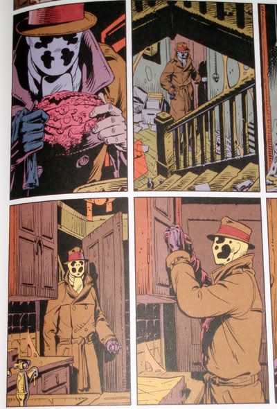 Sobre la hasta-la-náusea aclamada Watchmen, poco que decir que Decep no haya apuntado ya. La obra más representativa de Alan Moore y posiblemente la consagración definitiva de Gibbons. Si pongo esta foto es porque, hasta donde he leído por ahora, Rorschach se ha convertido en mi personaje favorito. Sin embargo, es una ley básica de la naturaleza que cuando desenmascaras a un (completo) enmascarado el encanto se pierde. Más aún cuando el tío es normal tirando a feucho (ni siquiera feo por deformidad y que ese fuera el motivo de la máscara). Más aún cuando Moore lo desenmascara sin ninguna importancia desde el principio. No, eso no me gusta. Pero Rorschach mola. Impresiones tontas e incompletas hasta ahora... por ejemplo el capítulo 1 me gustó bastante más que el 2, es sorprendente la habilidad de Moore para presentarnos un aluvión de personajes desconocidos sin que la historia se nos haga más extraña que la leche frita para los ingleses. Por otro lado me gusta que plantee una prohibición a los superseres en la sociedad o un "acta de registro superhumano"... como 20 años antes que la Civil War de Marvel (Frank Miller también planteó una situación parecida en El Regreso del Caballero Oscuro). Oh, y el Dr. Manhattan también mola xD No sé. Llevo la mitad del libro más o menos. El problema es que he leído tantas veces que es la caña, que ya lo pillo esperando que, si es verdad, me asombre a cada página, y no es así (hombre, no sería Alan Moore sino DIOS si me asombrara a cada página). Por un lado eso y por otro mi escepticismo, o más bien mi favoritismo por Frank Miller, tal vez me están impidiendo disfrutar de Watchmen tanto como debería xD pero ni por asomo discuto que sea una gran obra. Aún me queda medio libro en el que no me cabe duda de que acabaré muy satisfecho. Y se acabó por hoy. No cambien de canal, damas y caballeros, porque mañana posiblemente haya más |