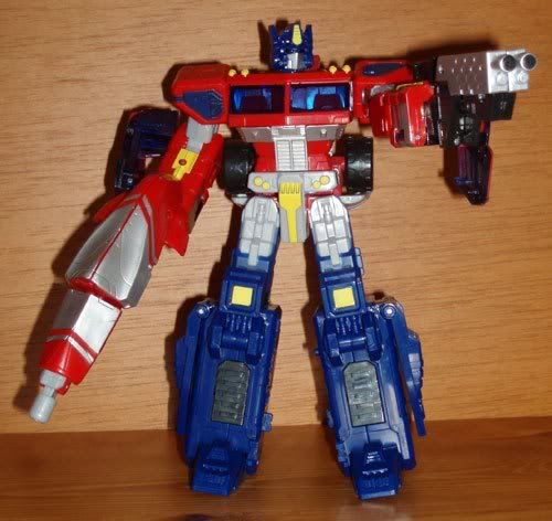Poco se puede decir de esta figura. Como cabe esperar en un Optimus, es un buen molde, bien pintado y con suficientes detalles y posibilidades. Yo al menos no le saco fallos. Fue el primero que abrí y me sorprendió gratamente que a ningún Universe/Henkei se le quedan piezas sueltas (armas) fuera del modo alterno, sino que todas quedan integradas en la transformación. Esto es especialmente chulo en el molde Optimus (o Ultramagnus o Nemesis Prime o Shattered Glass Optimus...) ya que las chimeneas del camión se convierten en su arma principal, y el quitavientos en esa especie de rifle. Muy, muy chulo. Por supuesto, perfectamente sólido y estable.
