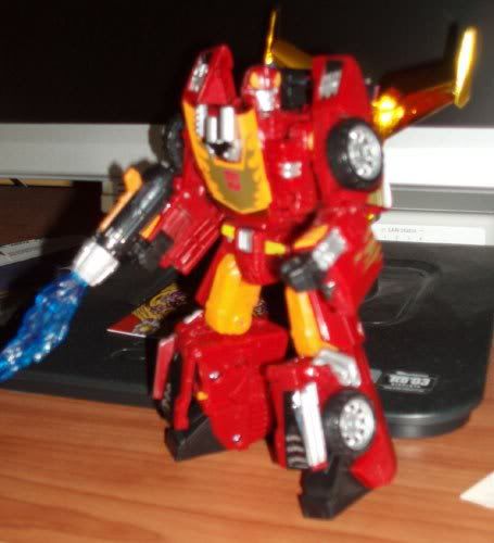 ...porque aquí llega, en pocas palabras, la gran decepción. Una figura que en las fotos se ve bastante aceptable pero que luego resulta ser más o menos enana y que además lleva la fidelidad a G1 a su nivel más nefasto: el ladrillismo. Rodimus es, poner decirlo de forma sencilla, un mazacote con una mínima movilidad condenado a permanecer con los brazos alineados al torso y... poco más. No contentos con eso, su arma es casi una broma de mal gusto (sobre todo comparándola con lo correctas que son las de todos los demás). Lástima, creía que sería el primer Hot Rod / Rodimus que me gustara.