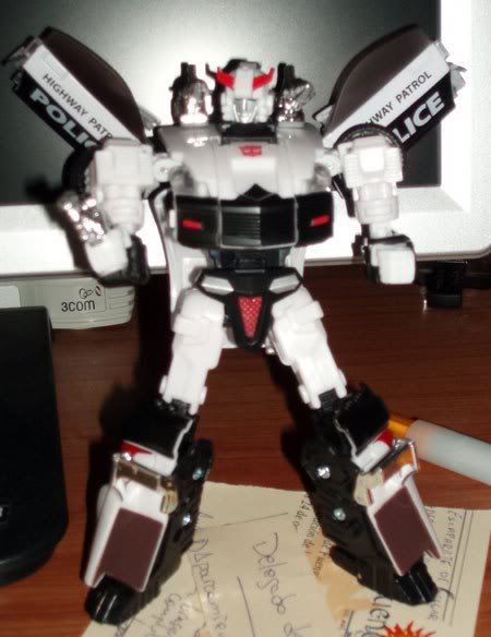 Y por fin Prowl. Le tenía muchas ganas, sólo para verme muy decepcionado también. Claro, siendo Prime el primero que cogí, me esperaba mucha más calidad de este, y me sentí ridículamente estafado. Una transformación que me pareció demasiado trabajosa para un deluxe (o para lo que ha sido Prowl siempre, no sé), tal vez más por el hecho de que enseguida se sueltan las puertas y crees que te lo has cargado, y es un coñazo ponerlo en cualquier postura. Da la impresión de ser enormemente frágil y su estabilidad es escasa. Para colmo, de espaldas o de perfil es bastante feito. Prime, Mirage o incluso Bumblebee superaron mis expectativas respecto a las fotos en webs, mientras que Prowl, desgraciadamente, ha conseguido todo lo contrario. Una pena.