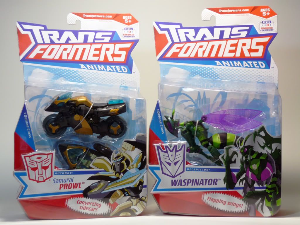 En definitiva....y pese a todo....es una figura muy pero que muy recomendable.....a mí me ha gustado tanto que ya esta sustituyendo a su versión original en la vitrina reservada a la Beast Wars......y para que os hagáis una idea os dejo esta última imagen de familia.... Para colmo no dejaba de ver que los precios....lejos de bajar no hacían más que subir....tanto que incluso superaban a los precios que tienen en una tienda de Barcelona que traen cosillas de importación.....así pues me cansé y me pillé este par..... También estuve esperando a que me llegase Lockdown....a las tiendas normales.....mientras lo tenían en esta otra tienda de importaciones....y resulta que nunca lo vi y finalmente en la tienda esta se le acabaron....así que ahora mismo está de camino a casa....ya me lo tuve que comprar por ebay....y estoy viendo que seguramente también me acabe comprando por ebay a Shockwave que es el último Animated que me hace gracia tener.... Waspinator.....pues en realidad me ha gustado muchísimo.....creo que tiene muy buen modo alterno y muy buen modo robot....es más diría que es la mejor representación del personaje de la Beast Wars.....aunque estaba muy mal acabado y debido a una torpeza muy impropia de mi....le hice un arañón al intentar quitarle una rebaba sumamente grande que todavía tenía del molde....en fin...últimamente estoy algo torpe...que rabia....menos mal que tampoco es una figura de colección o algo así... Pero esperaros....que este post todavía tiene una última sorpresilla....