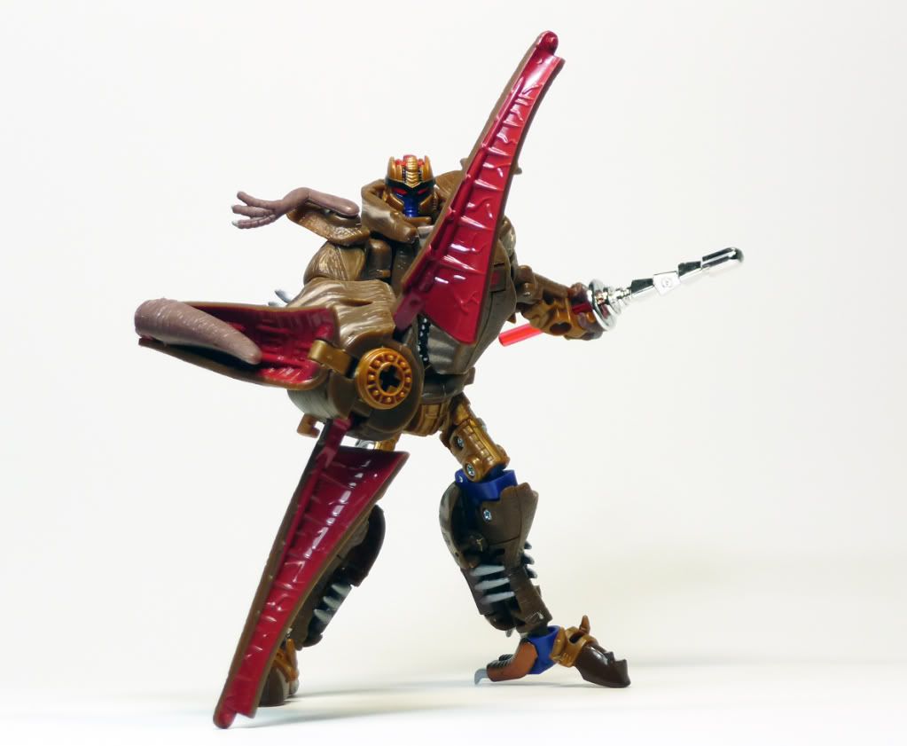 Por suerte las armas nuevas no son tan odiosas como cabía esperar.....ya que afortunadamente el Henkei tiene cromado el misil-espada con lo que luce muy bien....y la cola-cuchilla pues pese a no poder girar tiene el detalle del lanzamisiles y si le ponéis algo de imaginación hasta puedes hacer ver que lo que rodea la boca del lanzamisiles son más misiles....y no sé....eso le da a Dinobot una autentica arma de fuego....que no sea solo lo de los ojos láser....que personalmente siempre me pareció cutrecillo.... La nueva cabeza sin duda es una pasada.....además de haber añadido detalles que si bien no eran necesarios no dejan de ser un extra....como lo de la insignia del pecho que cambia....detalle que me ha agradado mucho...ya que en anteriores reediciones de las figuras Beast Wars, que eran repintados que pretendían ser más fieles a los personajes de la serie, tenían la manía de pintarles las insignias de modo que eran visibles en su modo animal...cosa que no me convencía y en este caso la insignia la puedes cambiar y no se ve.....y bueno lo de tener un juego de manos con dedos.....pues no lo encuentro útil...pero es un detalle...ya que puedes dejarle las manos garras si quieres así que no hay problema...