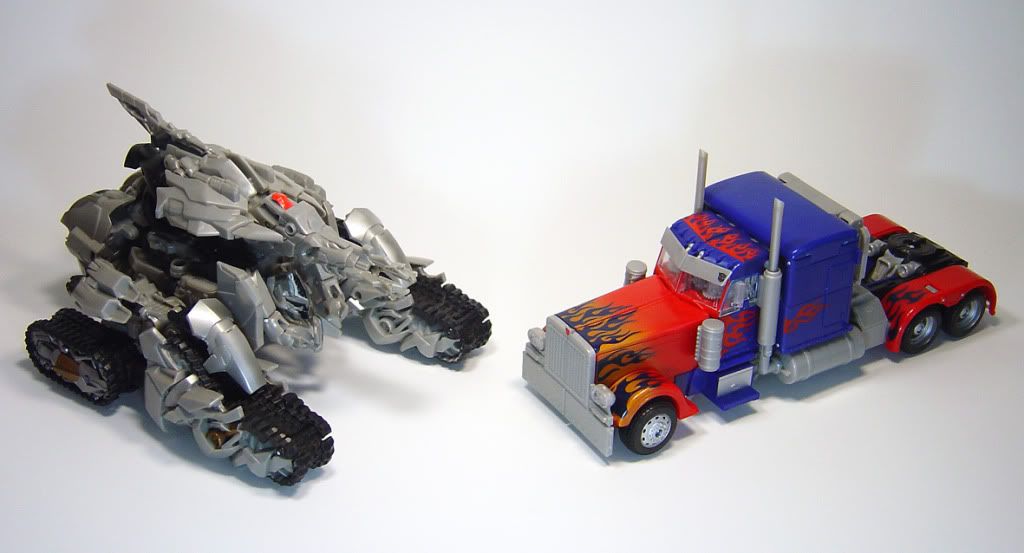 No sé si esto le sucede a todos los Skids o me ha tocado al mío….pero en sus piernas….por debajo de la articulación de la rodilla hay otra articulación que forma parte de la transformación…..que se distingue entre la pieza gris y la verde de la pierna…..que queda sumamente floja…..y con el peso de la “mochila”…..la figura es difícil de posar y de estabilizar…..y el único modo de sostenerla erguida es apoyando las partes del coche de sus piernas con el capó de la espalda como muestro en esta foto….. No sé si me he explicado…..en fin….es un gran y pequeño defecto…..que desmerecen esta preciosa figura….en fin….haber si se me ocurre algún método para solventarlo….pero lo veo complicado…. Aún así estoy resuelto a llegar a conseguir las tres motos y ver que tal quedan fusionadas…. Pues aquí esta Demolishor….que tiene una de esas transformaciones o diseños curiosos que a mí me agradan…..pero como todos los deceps patina en proporciones…..y en fin todo lo que se ha criticado de estas figuras de los constructicons….. De momento ya lo tengo……y como ya comente…..dudo que tengan valor para desarrollar mejores figuras de los consturcticosn… Está pendiente de fotos comparativas con su antecesor…… Lástima que sea más pequeño aún que el primero….esto es una de las cosas que más me mosquean…. Y a destacar las grandes diferencia con su prototipo y el modelo de producción….una lástima… Solo cabe esperar a ver si sacan la prometida versión leader….y a ver qué tal bueno es…..que la verdad tampoco me espero gran cosa pero por lo menos será más grande….. Pues nada…..Megatron….si es más grande que el del 2007 pero como tamaño de figura es muy decepcionante en cuanto a fallos tan grabes como sus dos brazos…..uno rígido y el otro más enano todavía de lo que se muestra en la peli y además con menos articulación que los brazos de Wheelie….por ejemplo….. Total que como modelo de figura es más detallado y jugable el Megatron 2007 en mi opinión que el Megatron del 2008…..pero supongo que su diseño y su tamaño en cierto modo compensan ya que realmente transmite el yuyu que da este Megatron….. Y qué decir del Optimus…….una autentica pasada…..solo sería mejor si no hubiesen descuidado los materiales y también llevase metal y ruedas de goma como la versión del 2007…..pero supongo que con un diseño tan sobresaliente eso ya hubiera representado salirse del presupuesto de tamaño leader…. Al lado de Megatron….en esta ocasión casi son de la misma escala que en la peli…..pes que Mega debiera se aún más grande….. Observamos también de paso lo feo que queda Megatron en su modo tanque…..