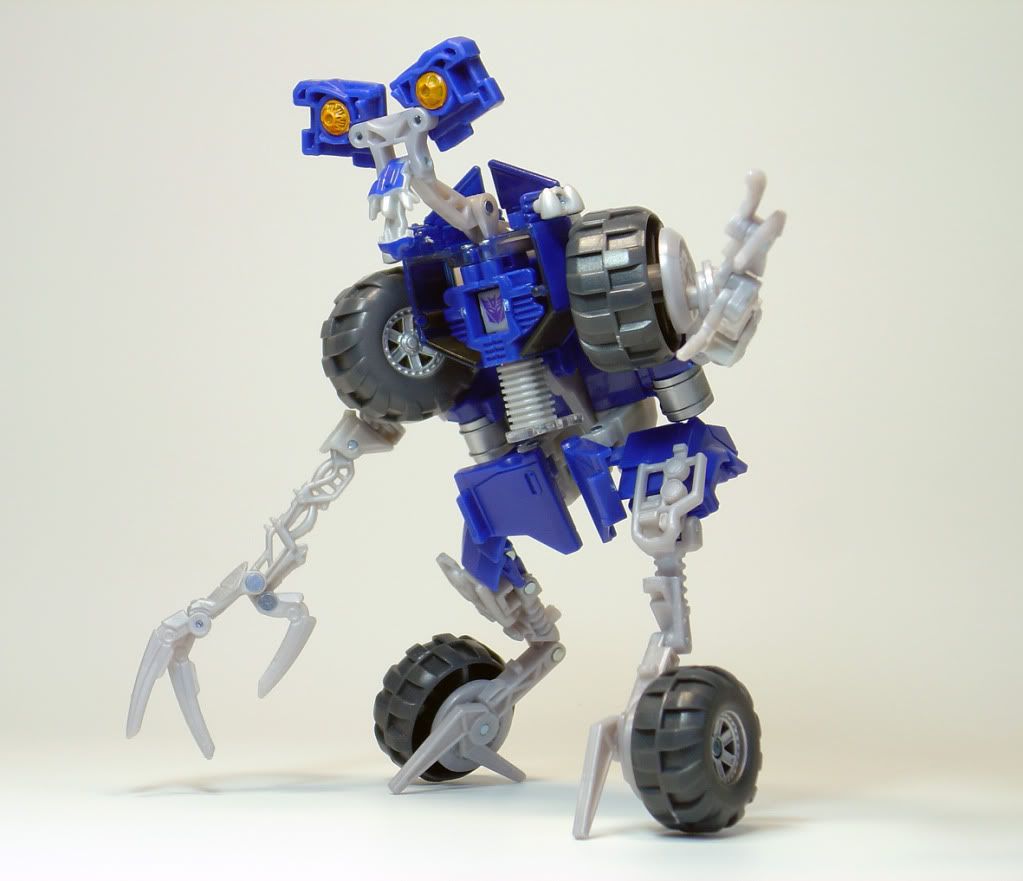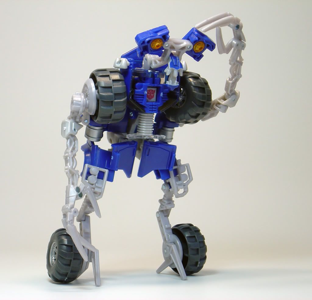 Personalmente Wheelie….es una pasada…..no tanto como robot molón….que tampoco lo pretende según el personaje….sino como figura divertida….. Quisiera apuntar que una de las cosas que más me agradan del mundo de las películas….son la variedad y riqueza de diseños o formas de las figuras….. En el caso de las películas se abre un nuevo enfoco muy poco explorado en el pasado….donde directamente no todos los modos robots pretenden ser humanoides…..lo que para mi tiene más lógica argumentativamente……ya que los Trans son alienígenas……y no entiendo el porqué de convertirse siempre en humanoides….. Total…..que este nuevo abanico de formas alternas…..no solo es gratificante por su variedad, por demostrar un pequeño esfuerzo en enseñarnos cosas nuevas y mejorar en definitiva en vez de quedarse estancados…..sino que permite definir mejor las personalidades de cada individuo y dan como resultado diseños….que por lo menos a mi…..me transmiten más emociones…… Y es en el caso de este Wheelie donde más se nota esta pequeña paranoia mía…… -Soy un malvado Decepticon…… Na no me hagáis caso….se me va la olla de vez en cuando…. Es realmente un crío robótico….no hay duda…..rebosa inocencia picardía juventud…..y no solo eso sino que lo hace en consonancia con el resto de su cuerpo….. Lástima que esto no suceda con casi ningún Decepticon…..juuu… Solo este detalle que muestro me mosquea del Skids…..
