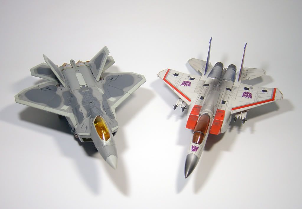 Dos Starscream Dos Masterpiece uno más que el otro pero aquí están Salta a la vista que el Masterpiece inspirado en la G1 estamucho más elaborado en su forma alternativa que su versión movie Vistos desde arriba no hay mucha diferencia Vistos de frente se empieza a percibir el sobredimensionadovientre del Raptor aunque no es demasiado grave y se podría decir que todavíada el pego