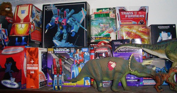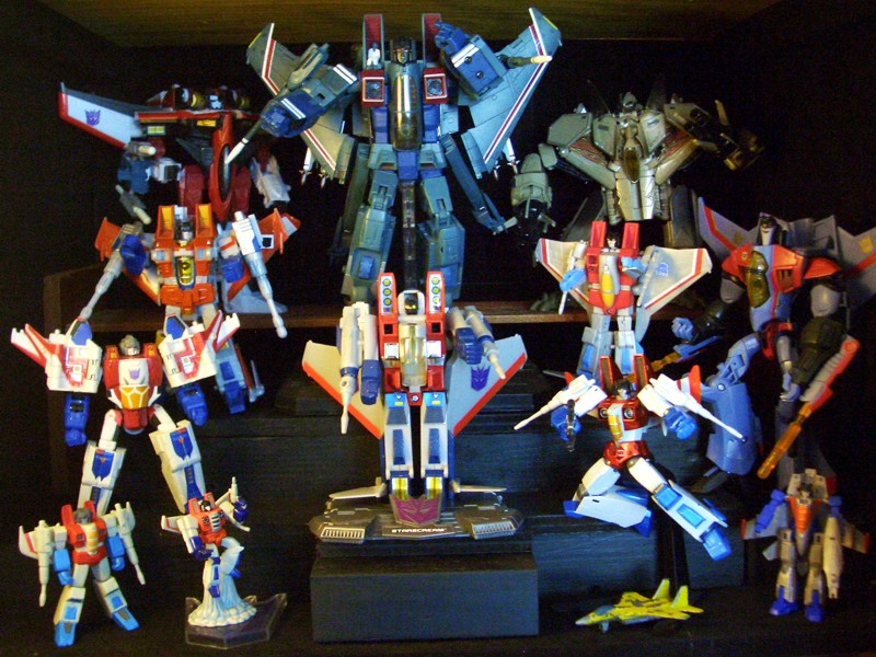 La segunda foto que pondré es de mi colección de Starscream. El personaje tiene mucha tela de donde cortar, mas para mal que para bien. El cariño que le profeso es porque fue mi primer Transformer y porque me encanta que los robots que vuelan. He aquí lo más preciado de mi colección: Click para ver más grande, aunque está muy granulada la foto, necesito una camara propia, la tomé prestada |