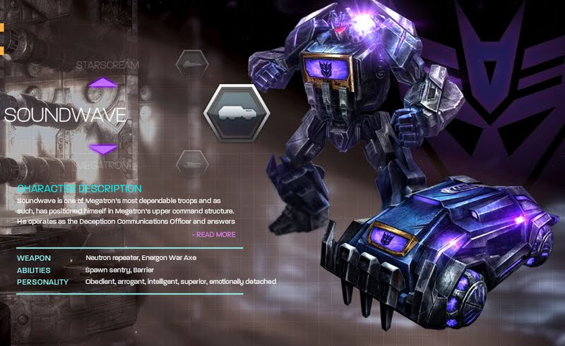 mdverde Alto Consejo Cybertroniano | #70• 397: Cybertronian Soundwave Generations DeluxeGracias a mi nueva cámara, por fin puedo retomar la publicación de las nuevas adquisiciones de la colección, aunque me va a llevar bastante tiempo ponerme al día porque tengo como 15 nuevas figuras sin fotos. La figura es tamaño Deluxe y es muy similar al diseño del personaje del juego. La transformación es medianamente compleja, pero entretenida y el modo vehículo queda muy solido. |