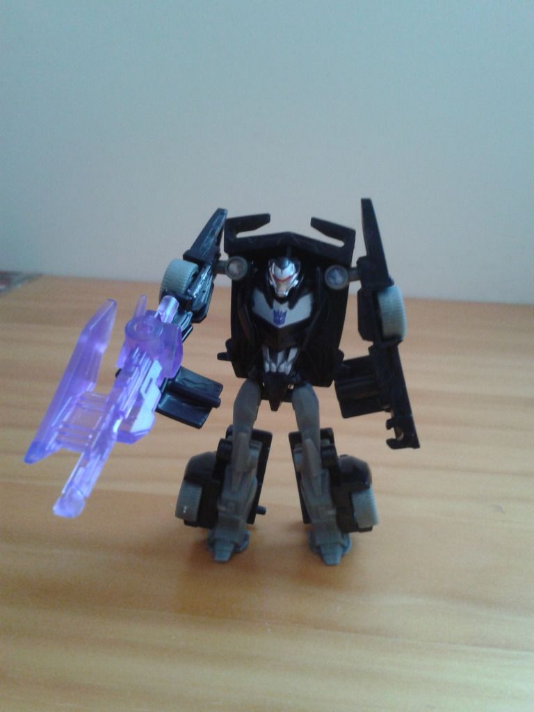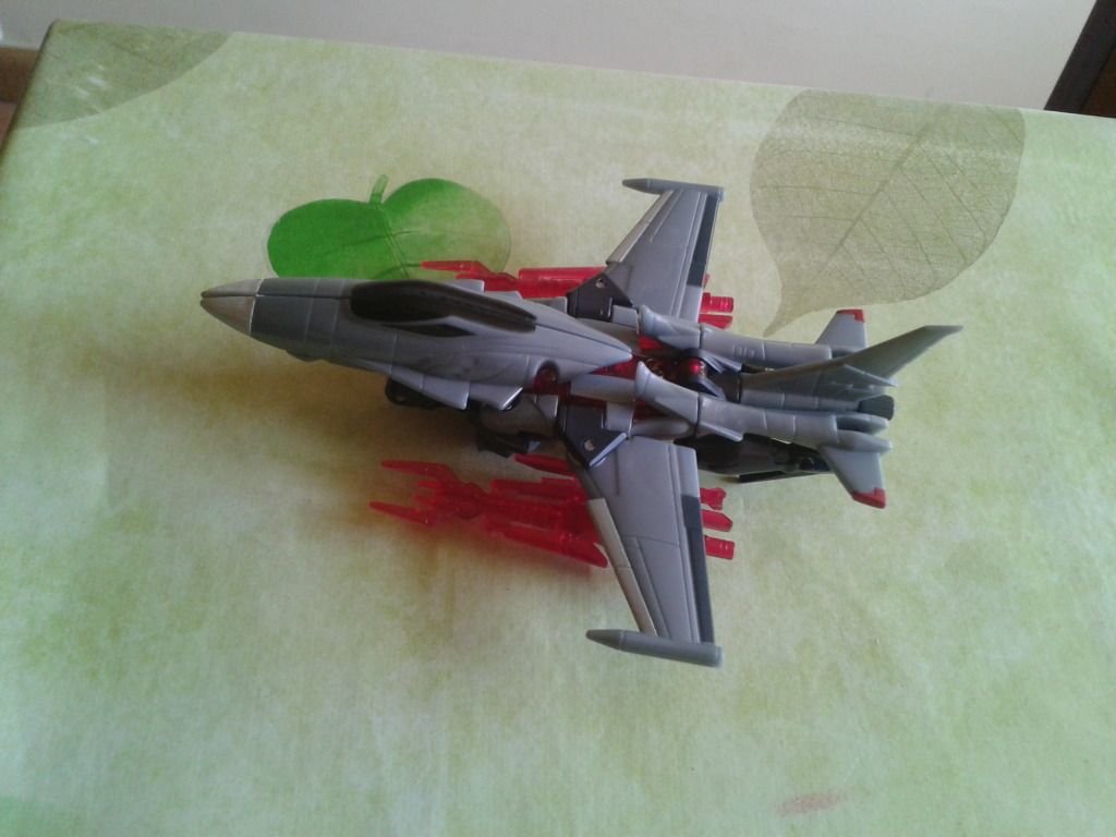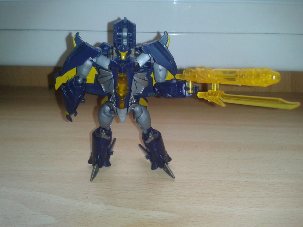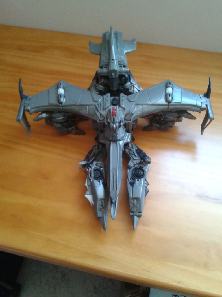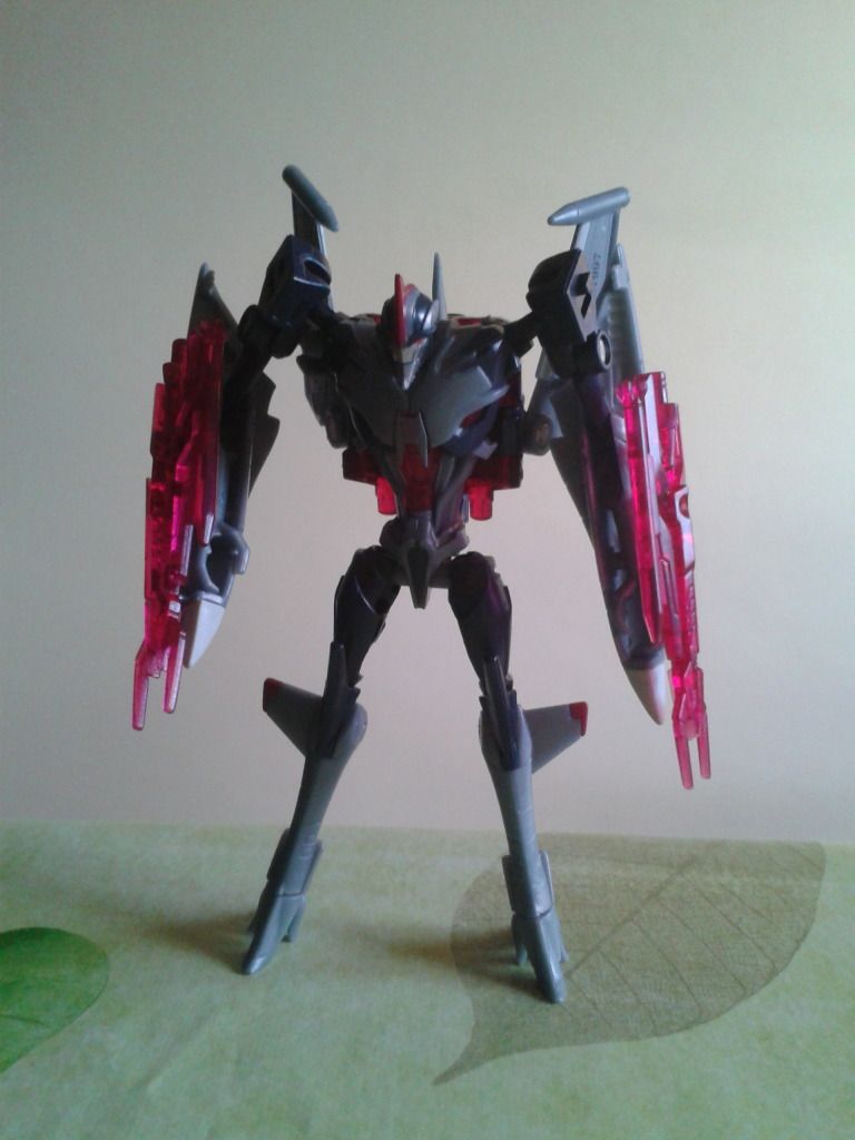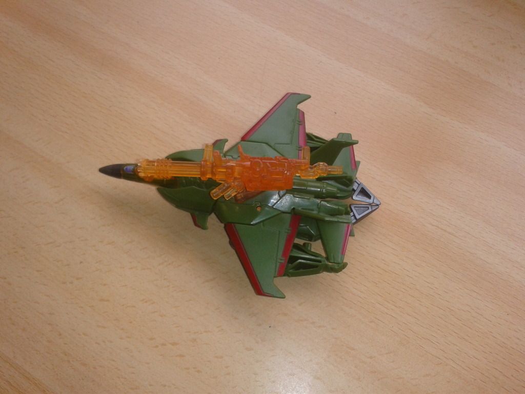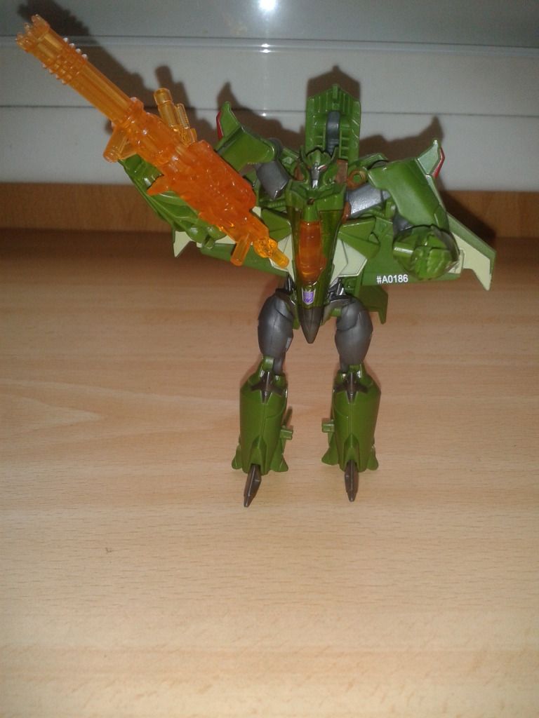 Starscream Este peca de armas desproporcionadas y en modo jet, no me gusta que tenga el morro suave y la cola del jet, sólo para que un crio tonto no se saque un ojo. Robot
